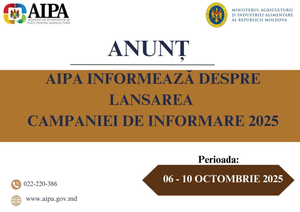 Agenția de Intervenție și Plăți pentru Agricultură (AIPA) anunță lansarea Campaniei de informare „Oportunitățile de subvenționare din FNDAMR – 2025”, care se va desfășura în perioada 6 – 10 octombrie 2025, în mai multe localități din țară.